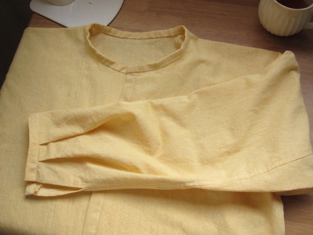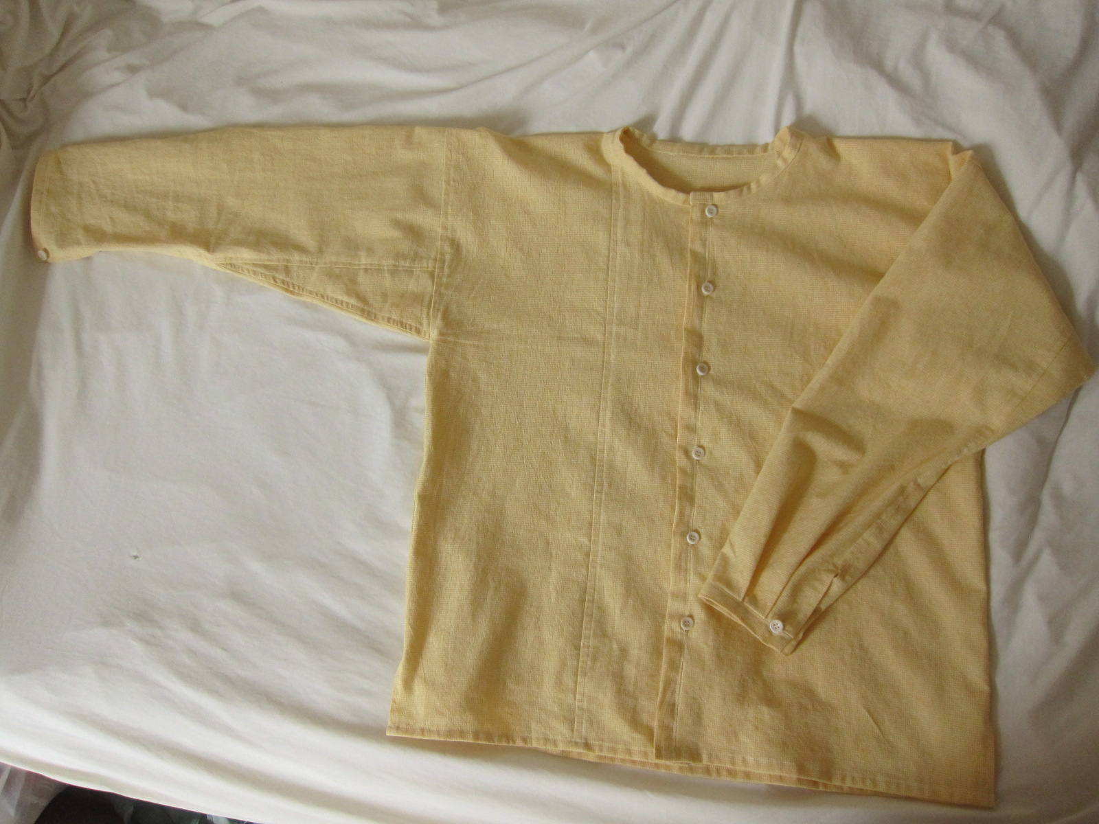 冊子によると、このシャツが作られていた当時は着物用の幅のせまい布を使って手縫いで作っていたそうで、何枚も重なったところを手縫いして押さえのステッチを入れるのは大変だっただろうなと思いました。(私はミシンで作りました。)